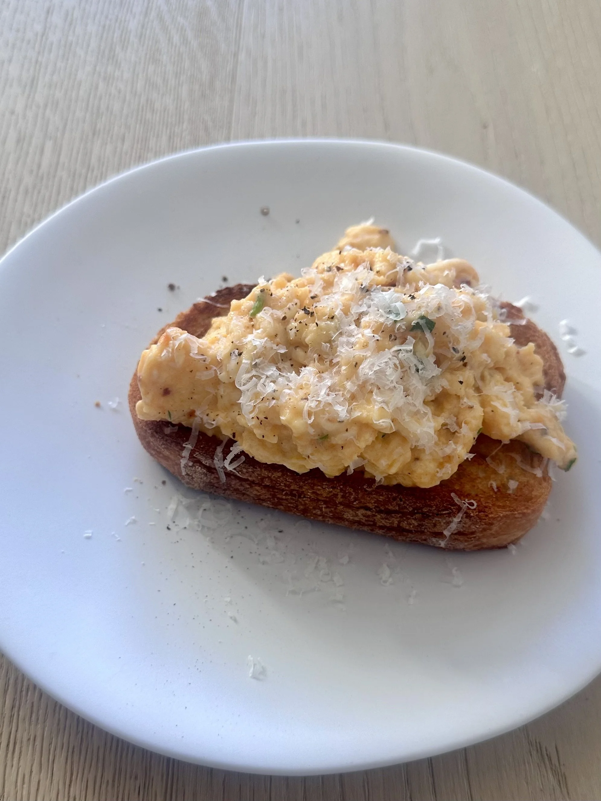 Keep a jar of crispy chilli oil on hand and you’ll always be able to whip up this delicious take on scrambled eggs. On any given day we probably have a few different chilli oil options to choose from but Marion’s Kitchen is a favourite at the moment or Laoganma is always in our fridge.