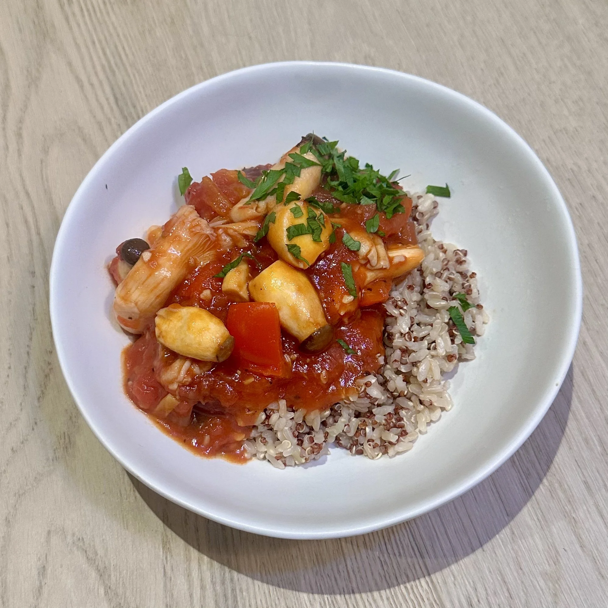 Adam and I do ‘Meat-free Monday’ each week and this week I was inspired by some leftover Kalamata olives I had in the fridge. Given mushrooms have a fairly meaty texture I thought it would make for a good sub for chicken and I wasn’t wrong. I served this with brown rice and quinoa to use up an empty packet but you could do white rice, pasta, cous cous or even just some crusty bread.